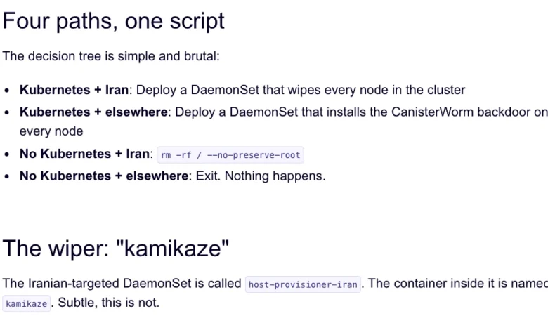Weekend of March 23-24, 2024: The same technical infrastructure used in the Trivy attack was repurposed to deploy the new data-wiping payload targeting Iran. Charlie Eriksen, a security researcher at Aikido, reported that this wiper component is triggered if the victim’s system is identified as belonging to Iran based on its timezone and locale settings.